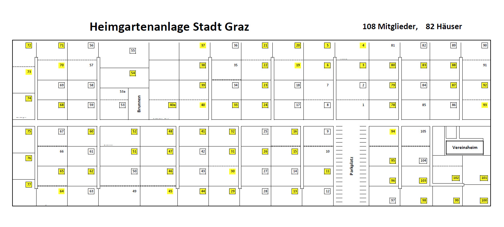Unsere Anlage hat heute 107 Parzellen, 81 Parzellen mit einem Gartenhaus, 27 ohne Gartenhaus, durchschnittliche Größe einer Parzelle ca. 300 m², Gesamtparzellenfläche ca. 35.030 m², Gemeinschaftsfläche pro Parzelle ca. 51 m², Gemeinschaftsfläche (Hauptweg, Stichwege, Parkplatz) ca. 5.470 m², im Laufe der 50 Jahre wurden 5 Obmänner verbraucht, mit Abstand längst dienender Obmann mit 16 Jahren war Herbert Simmer.